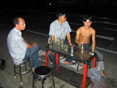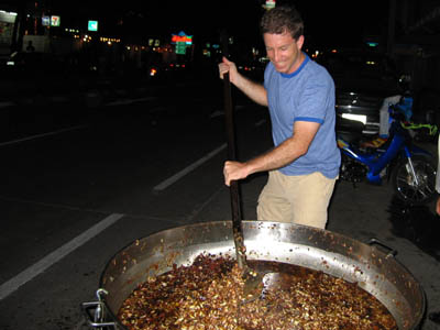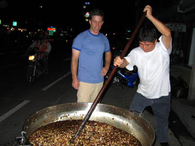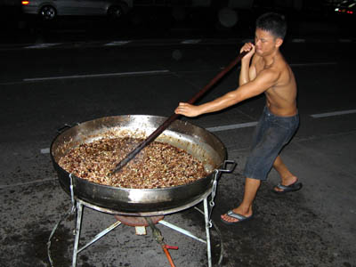 Posted by Stuart at 12:50 PM on September 02, 2005I was riding my motorcycle down Thong Lo on the way home last night when I saw a shirtless teen-aged boy stirring a huge skillet over a gas flame on the side of the road. I had never seen anything like it, so I just had to do a u-turn and find out what was going on.