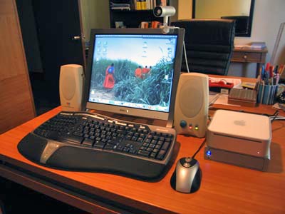 - Mac Mini. 1.42 GHz. 80 GB HD. 1 GB RAM. WIreless and Bluetooth. (the Mini small white box to the right in this pic)