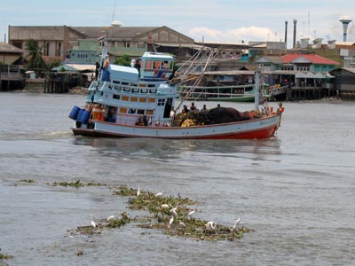 | This river at Mahachai is very close to the Gulf of Thailand, and so there were many fishing boats like this one. I was also trying to take a picture of the birds who were standing on floating plants in the middle of the river. |