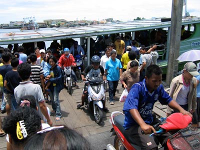 | A look at the chaos of getting on and off the ferry across the river. And yes, you are allowed to bring your motorcycle on the ferry as well. |
