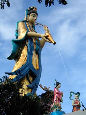 | The first stop after Ban Laem station is at this temple, with a huge statute of the Chinese goddess Kuan Yin pouring water out of her vase. Her two acolytes, Long Nu and Shan Tsai, stand in front of her. |
