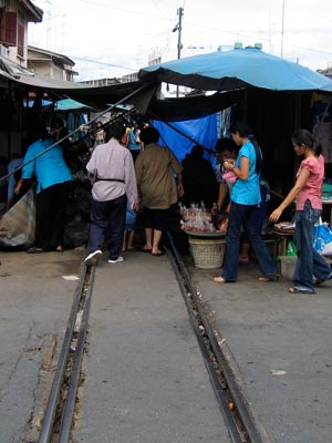 | Amazingly enough, these are the tracks that the Mae Klong train uses. When it's time to leave the station, the vendors hold back the overhead tarps to make room for the passing train. |
