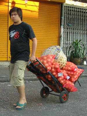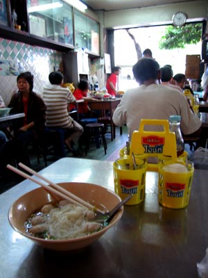 After leaving the temple, I walked down Charoen Krung Road a bit and was starting to get a bit hungry. So, I stopped for a bowl of noodles. They were, of course, delicious. I ordered the very simple dish of sen lek nam (thin white noodles with soup). You can see that they also added a few pork and fish balls to the mix. The soup is served with sugar, chilis, vinegar, and fish sauce in the yellow container (which, by the way, is advertising Lipton Ice Tea)