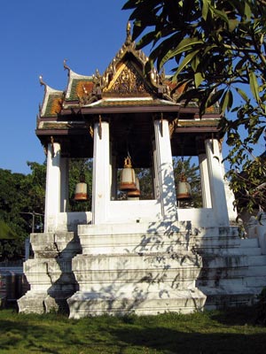 My next two stops were on the other side of the river, in Thonburi. So I walked past the Grand Palace and to Tha Chang (Elephant Pier), where I boarded a 2-baht (5 cent) ferry across the river to Wat Rakhang Khositaram. Rama I lived here before he became King, and the wooden building where he slept is still standing. Also of interest, are five large bells that Rama I gave the temple. (Hence the name Rakhang, which means bell.)