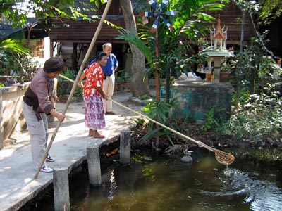 There is a wonderful, small park and a few Thai temples. But the thing that struck me most about Phra Pradang is just how quiet and peaceful it is. And along with the quiet and the green comes all of the wildlife that can be seen here -- birds, flowers, and big monitor lizards are all very common. And to think that chaotic, crowded, cement-filled, traffic-bound Bangkok is a short ferry ride across the river!